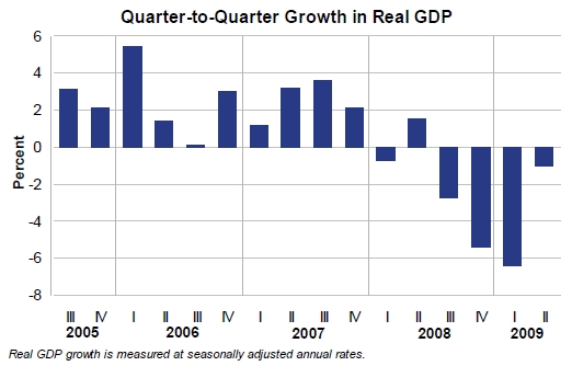 Real gross domestic product (GDP) declined 1.0 percent in the second quarter of 2009 after declining 6.4 percent in the first quarter, according to estimates released today by the Bureau of Economic Analysis. Details.